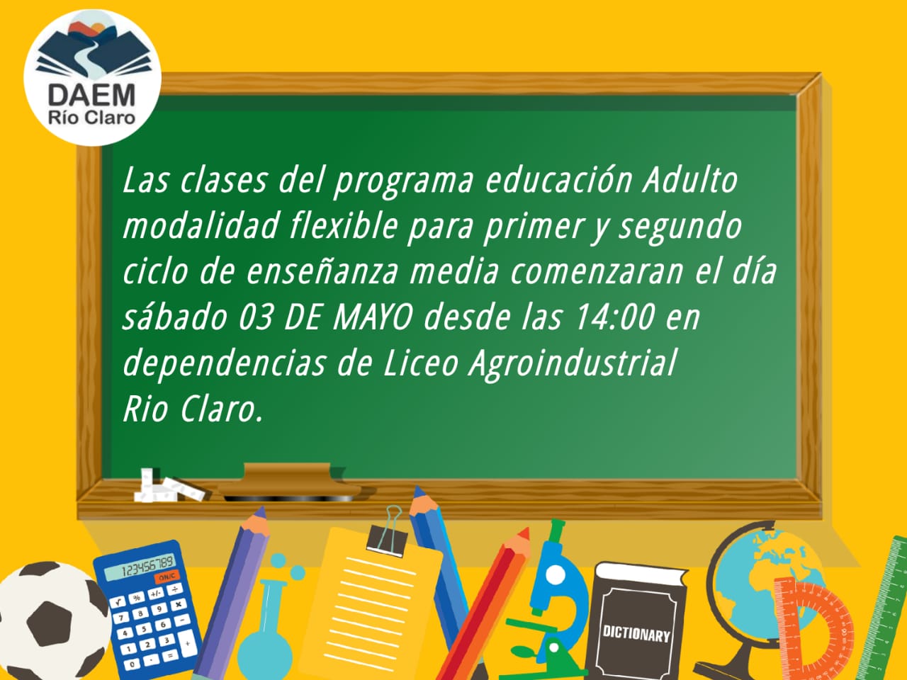 Notas En Línea DAEM RÍO CLARO: Clases del programa educación Adulto modalidad flexible para primer y segundo ciclo de enseñanza media Abril 25, 2025 Comparte en tus redes: FacebookTwitterWhatsAppPrint Comunicado: Las clases del programa educación Adulto modalidad flexible para primer y segundo ciclo de enseñanza media comenzarán el día sábado 03 DE MAYO desde las 14:00 en dependencias de Liceo Agroindustrial Rio Claro. ULTIMAS INFORMACIONES Colbún cuenta con un Centro de Atención Virtual ChileAtiende Notas En Línea Gestores culturales maulinos recibieron Premios Regionales de Arte, Cultura y Patrimonio 2025 Notas En Línea Gore Maule entregó carros bombas a cinco comunas y dos ambulancias para Molina Notas En Línea Por séptima vez Chile se corona como el mejor destino de aventura del mundo en los World Travel Awards Notas En Línea Parral ofrece diversas actividades de Navidad para las familias Notas En Línea Noticias relacionadas Notas En Línea IPS dispuso de plataforma digital para conocer las cotizaciones al nuevo Seguro Social Las cotizaciones al nuevo Seguro Social, de cargo de los empleadores, contribuirán a mejorar las pensiones de cientos... Notas En Línea Colbún cuenta con un Centro de Atención Virtual ChileAtiende El Instituto de Previsión Social implementó un nuevo Centro de Atención Virtual ChileAtiende en la comuna de Colbún,... Notas En Línea Gestores culturales maulinos recibieron Premios Regionales de Arte, Cultura y Patrimonio 2025 El Ministerio de Cultura llevó a cabo la entrega de los Premios Regionales de Arte, Cultura y Patrimonio... Notas En Línea Gore Maule entregó carros bombas a cinco comunas y dos ambulancias para Molina Bomberos de las comunas de Vichuquén, Río Claro, Romeral, Pelarco y Retiro recibieron nuevos carros bombas, en tanto...