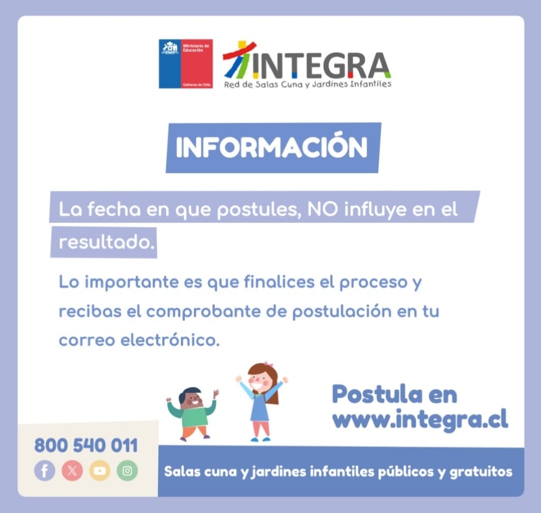 • El proceso de postulación a las salas cuna y jardines infantiles de Fundación Integra, para el Año Parvulario 2026, se inicia el 20 de octubre a las 11:00 y finaliza el 05 de diciembre a las 18:00 horas.