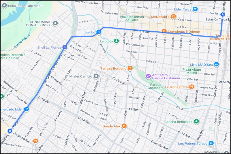 Sentido Oriente – Poniente Inicia en Calle 11 Oriente con 1 Norte, continúa por Avenida Dos Sur y finaliza en Calle 26 Sur por Avenida Ignacio Carrera Pinto. Sentido Poniente – Oriente Sigue el mismo recorrido, pero en dirección inversa, iniciando en Calle 2 Norte con 11 Oriente. En las calzadas se proyecta la siguiente señalización y elementos de segregación: demarcación termoplástica en zonas de parada e intersecciones, señalética vertical y horizontal específica para pista solo bus y segregadores físicos y delimitadores que separen claramente la pista exclusiva del resto de las calzadas destinadas a vehículos motorizados. Desde el municipio informaron que, se instalarán 216 nuevos paraderos de micros en Talca, a partir del 2026. Los cuales serán más modernos y entregarán un mejor servicio a la comunidad